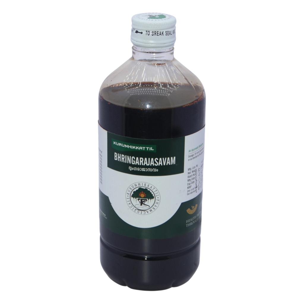 Bhringarajasavam is a classical Ayurvedic formulation prepared through natural fermentation, primarily used to support hair health and liver function. It contains key ingredients like Bhringaraja (Eclipta alba), known as “Kesharaja” (king of hair), along with other herbs that help nourish the scalp, promote healthy hair growth, and reduce hair fall and premature greying. This formulation also acts as a mild digestive and liver stimulant, helping improve metabolism and detoxification. Regular use supports overall vitality, strengthens hair roots, and enhances natural hair texture and shine.