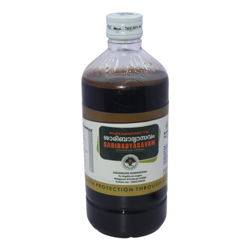 Saribadyasavam is a traditional Ayurvedic fermented herbal formulation mainly used for purifying the blood and improving skin health. It is prepared using natural herbs through a self-generated fermentation process, which enhances its therapeutic effectiveness and absorption.This formulation is especially beneficial in managing various skin conditions such as itching, rashes, acne, and other blood-related disorders. It helps detoxify the body, supports liver function, and promotes a healthy complexion. Saribadyasavam is also known to balance aggravated Pitta and Kapha doshas, thereby reducing inflammation and improving overall wellness.Regular use aids in cleansing impurities from the blood, improving digestion, and maintaining clear, healthy skin.